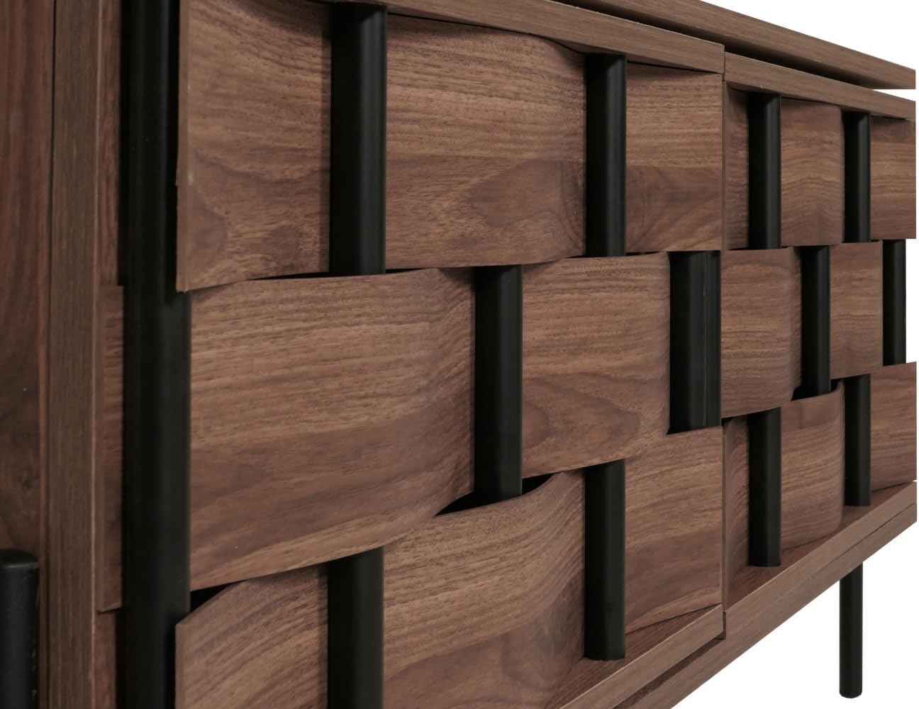 Nasza szafka RTV Mendler wyróżnia się wzornictwem plecionym 3D, które nadaje meblowi nowoczesny i atrakcyjny wygląd. Powierzchnia drzwi z wypukłym wzorem dodaje głębi i elegancji, czyniąc szafkę centralnym punktem każdego salonu. Naturalny kolor drewna mango harmonizuje z różnorodnymi stylami dekoracyjnymi, od skandynawskiego po industrialny.